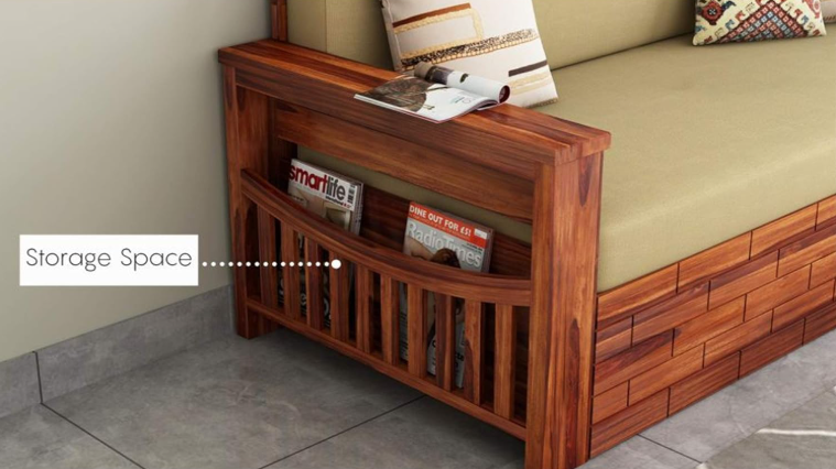 3-Person Sheesham Wood Sofa Cum Bed with Storage | Wooden Living Room Sofa Bed – Natural Brown | With Cushions