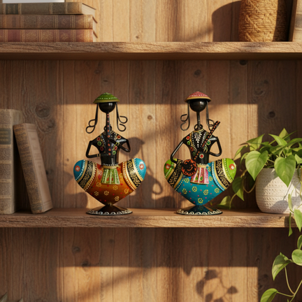 This charming handcrafted metal showpiece features a stylized female musician seated and playing a string instrument (such as a Sitar or Ektara).