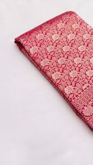 Weaving: Adorned with Exquisite Gold Zari Weaving, the entire body features intricate motifs (Jaal or Butis) that shimmer with every movement. The detailed border and opulent pallu showcase fine Banarasi craftsmanship.
