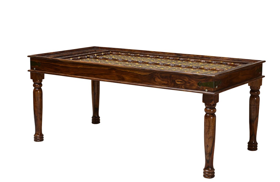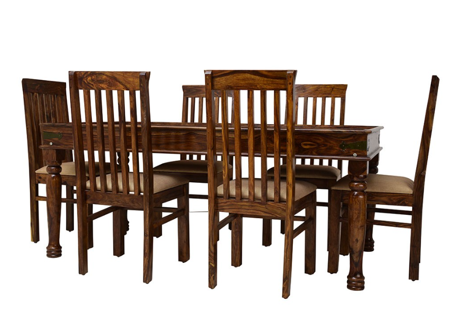 Gather your family and friends around this magnificent 6-Seater Dining Set, a masterpiece that seamlessly marries robust traditional craftsmanship with refined elegance. Crafted entirely from Solid Sheesham Wood (Indian Rosewood), this set showcases the wood's celebrated deep grain patterns, exceptional durability, and natural resistance to wear—ensuring it remains a treasured centerpiece for generations. The rectangular dining table features an exquisite central inlay with intricate detailing, protected beneath a durable glass or epoxy layer for both aesthetic appeal and practical maintenance. Supported by substantial turned legs that exemplify artisanal woodworking, this set combines timeless design with enduring quality. Perfect for those who appreciate authentic craftsmanship and desire a dining space that reflects both sophistication and permanence.